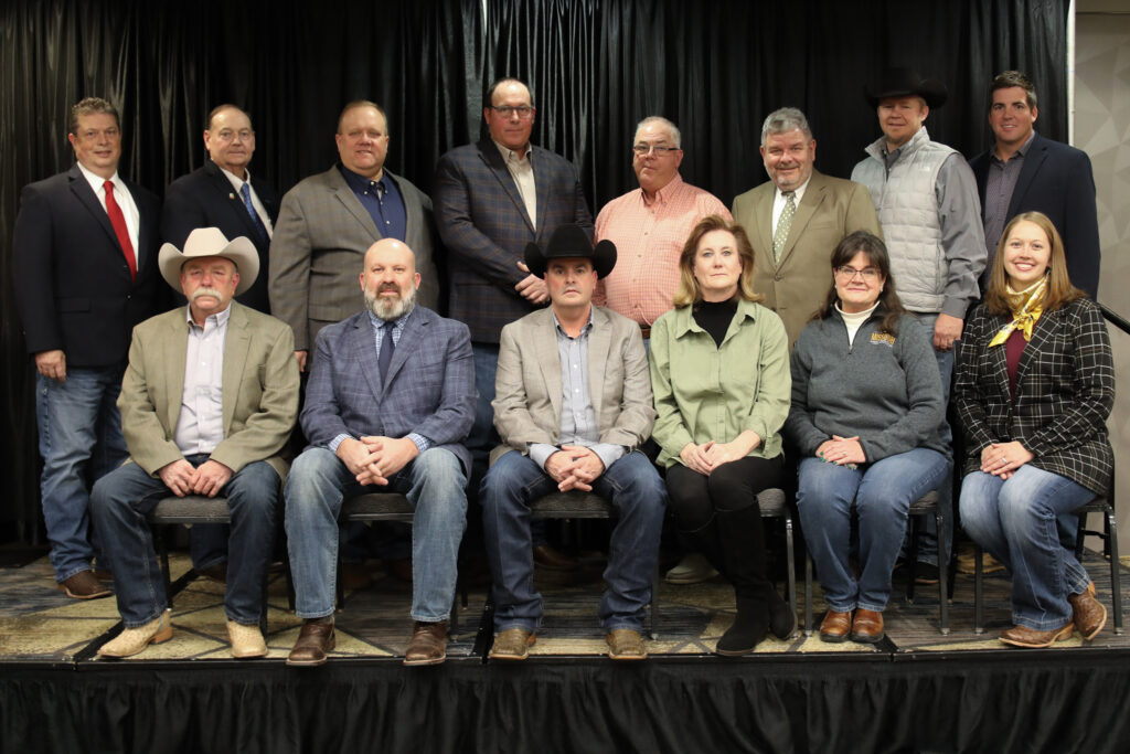 Pictured from left to right seated: President: Roger Behlmann, St. Paul; Past President: Tony Ward, Oak Grove; President Elect: Josh Gilbert, Oldfield; Vice President: Holly Meyer, Koshkonong; Secretary: Darla Eggers, Mexico; and Executive Director: Julie Conover, Holden. Back row: American Angus Association Board of Directors: Jim Brinkley, Milan and Alan Mead, Barnett; District 1 Director: Jeff Rhode, Stewartville; District 2 Director: Chad Sampson, Kirksville; District 4 Director: Mark Womack, Doe Run; District 5 Director: Doug Frank, Wentzville; District 7 Director: Tanner Dowling, Fair Grove; and District 8 Director: Sheldon Shaver, Salem. Not pictured: Treasurer: Dave Eversole, Rocheport; District 3 Director: Chas Wheeler, Paris; District 6 Director: David Warfield, Butler; and District 9 Director: Billy Wallis, Millersville.